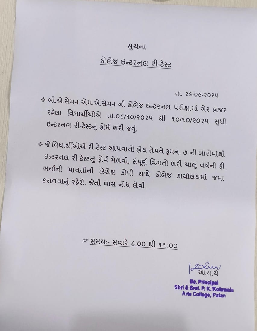 સમય મર્યાદા પૂર્ણ થયેલ વિદ્યાર્થીઓની પરીક્ષા અંગે ટાઈમટેબલ અને સીટ નંબરનું લીસ્ટ