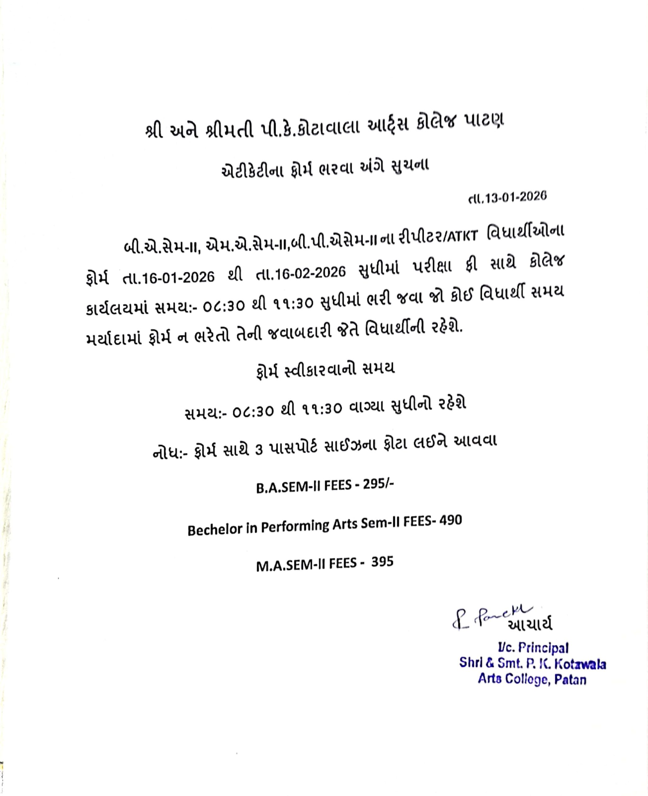 BA Sem-3 & 5, BPA Music Sem-3 & 5 and MA Sem-3 યુનીવર્સીટી પરીક્ષા ફોર્મ ભરવા બાબત