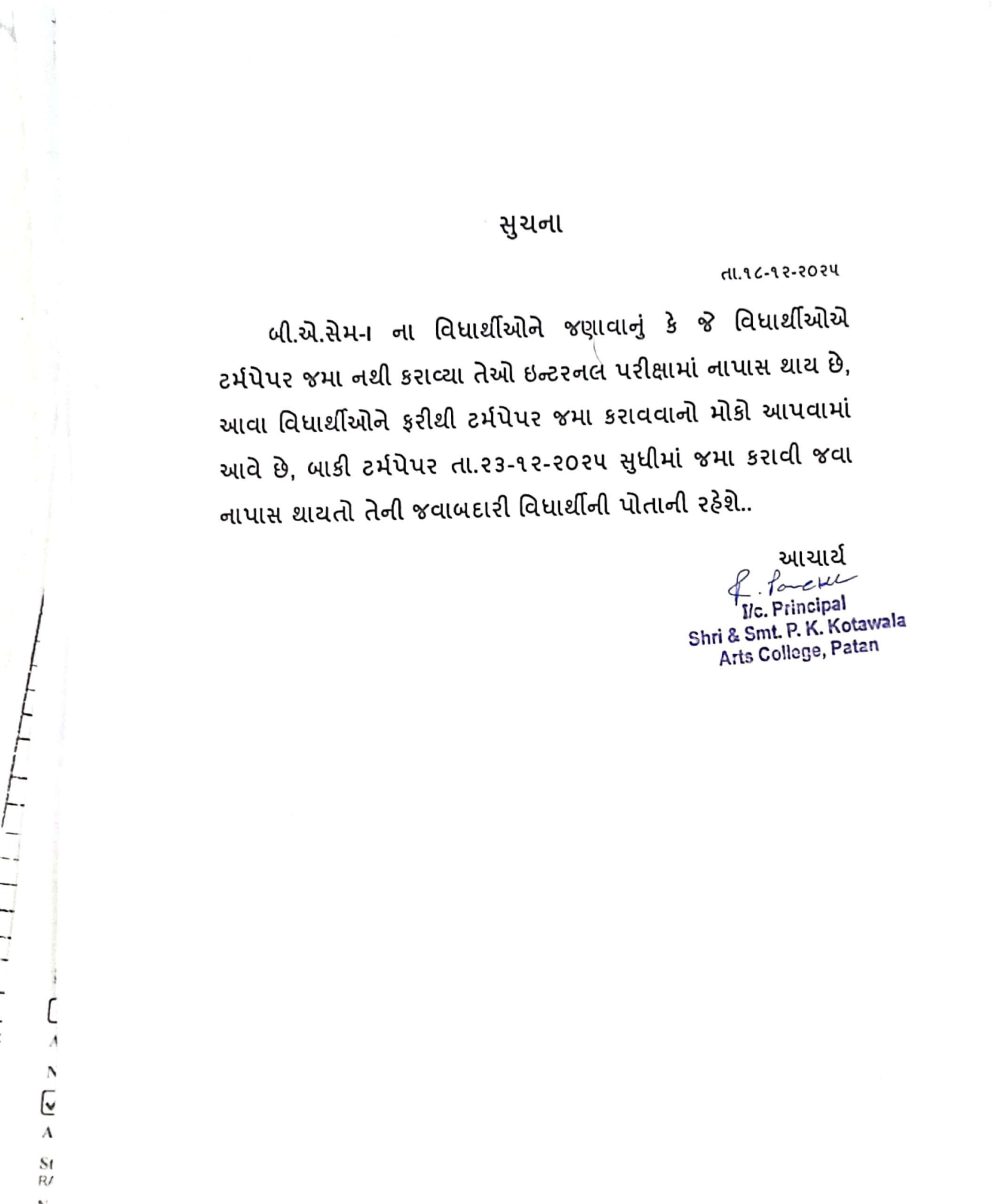 બી. એ . સેમ -1 ના વિધાર્થીઓ માટે ની સૂચના